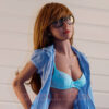 This is a 155cm 5ft08″ flat chest tiny waist young student girl premium TPE sex doll Emily, she is wearing a blue checkered student uniform and short skirt suit, with long golden brown hair and black frame glasses. She is a very quiet and lovely young student tan skin sex doll. Her waist is very slender, which is her characteristic, her chest is small and round, and her hips are round and straight. She is very energetic.